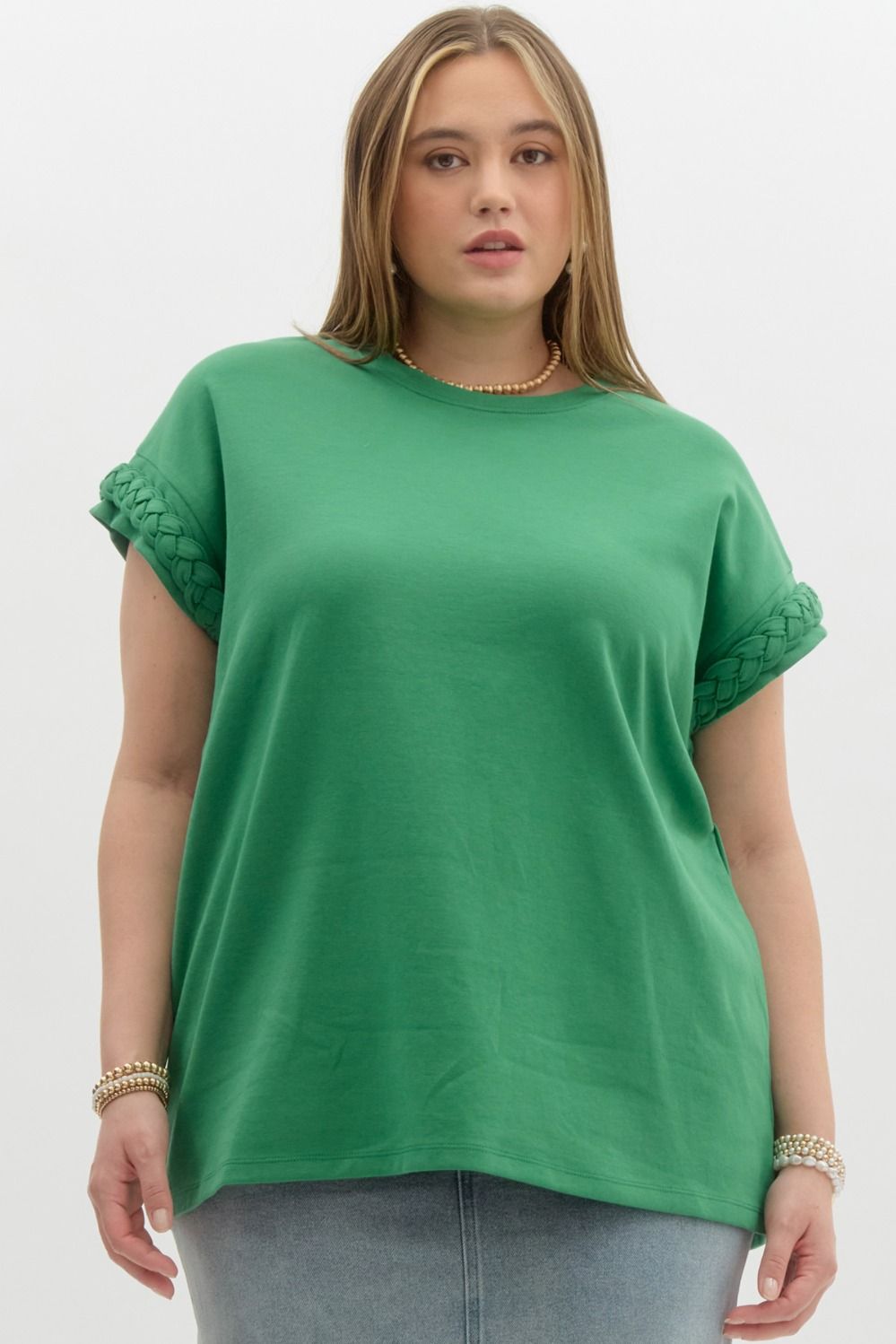 Curvy Green Braided Sleeve Knit Top