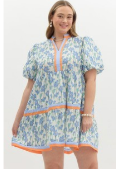 Curvy Pouf Sleeve Blue & White Floral Dress