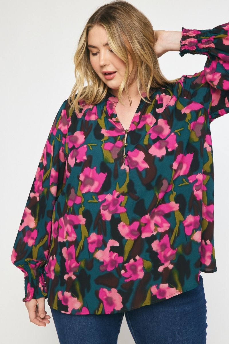 Green & Pink Floral Long Sleeve Vneck Top