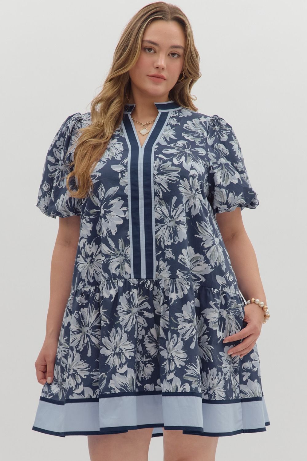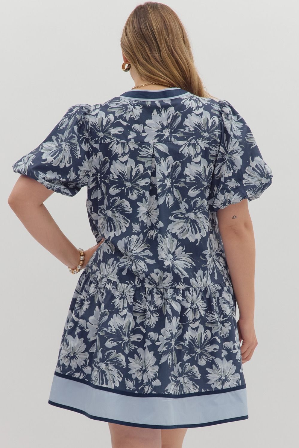 Navy Floral print short bubble sleeve ruffle hem mini dress +