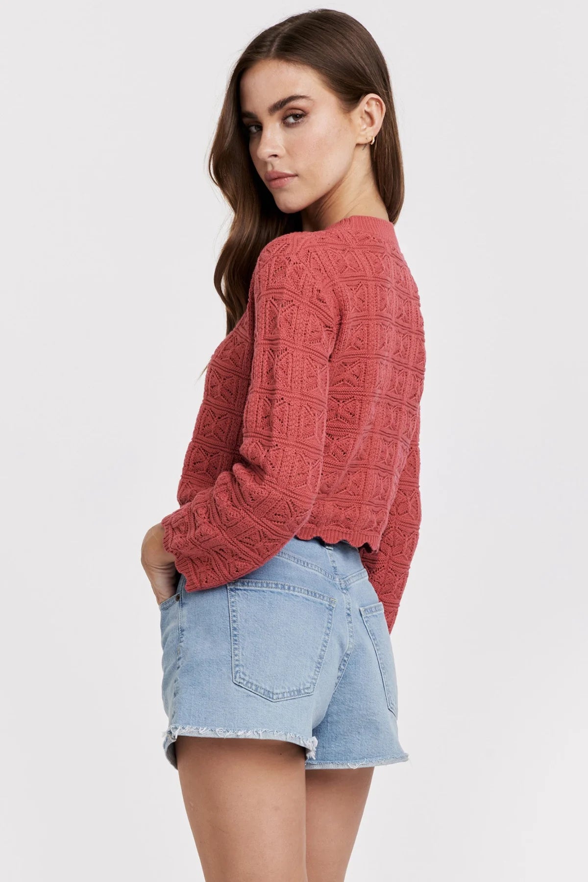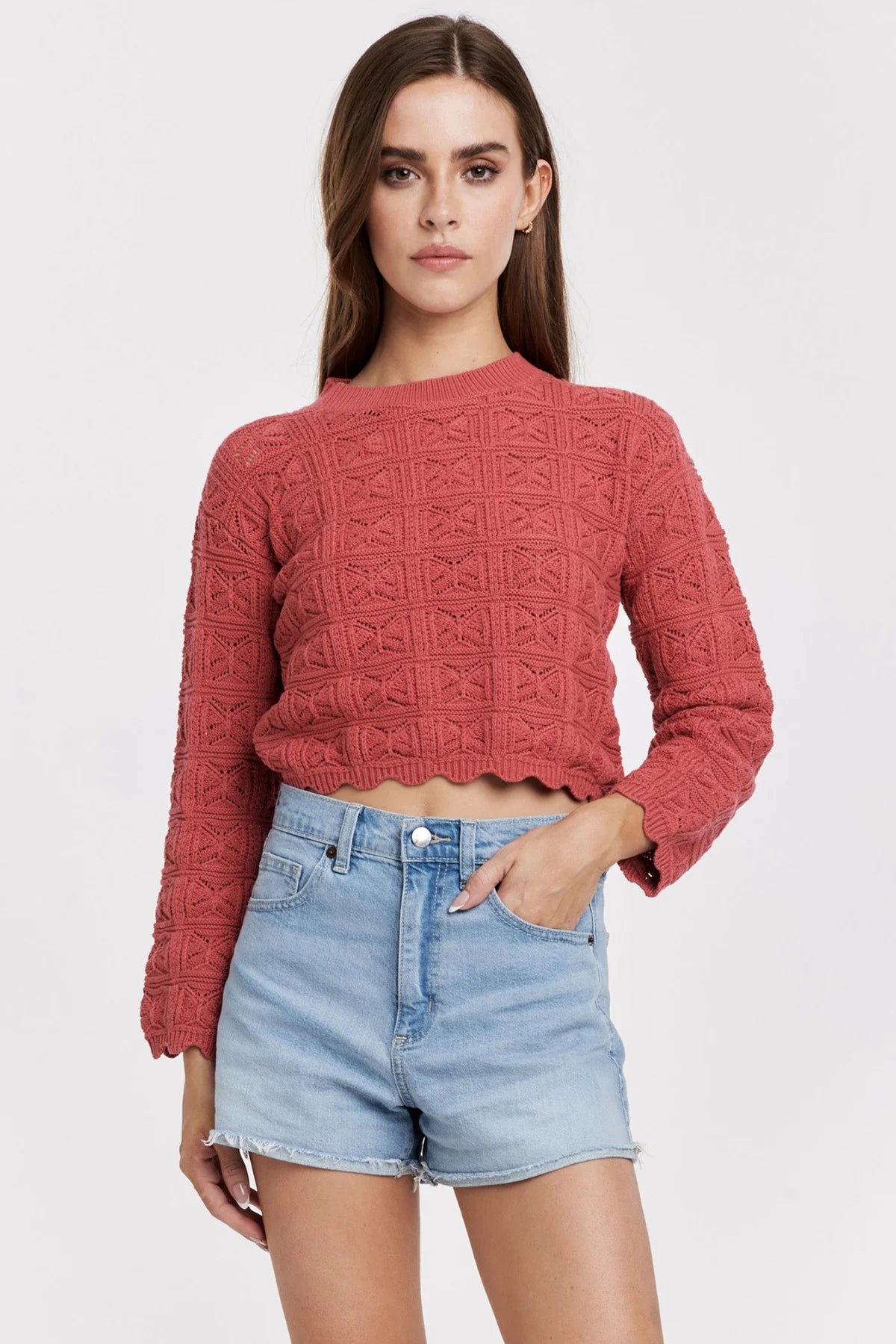 Uma Dark Coral Scallop Trim Long Sleeve Sweater